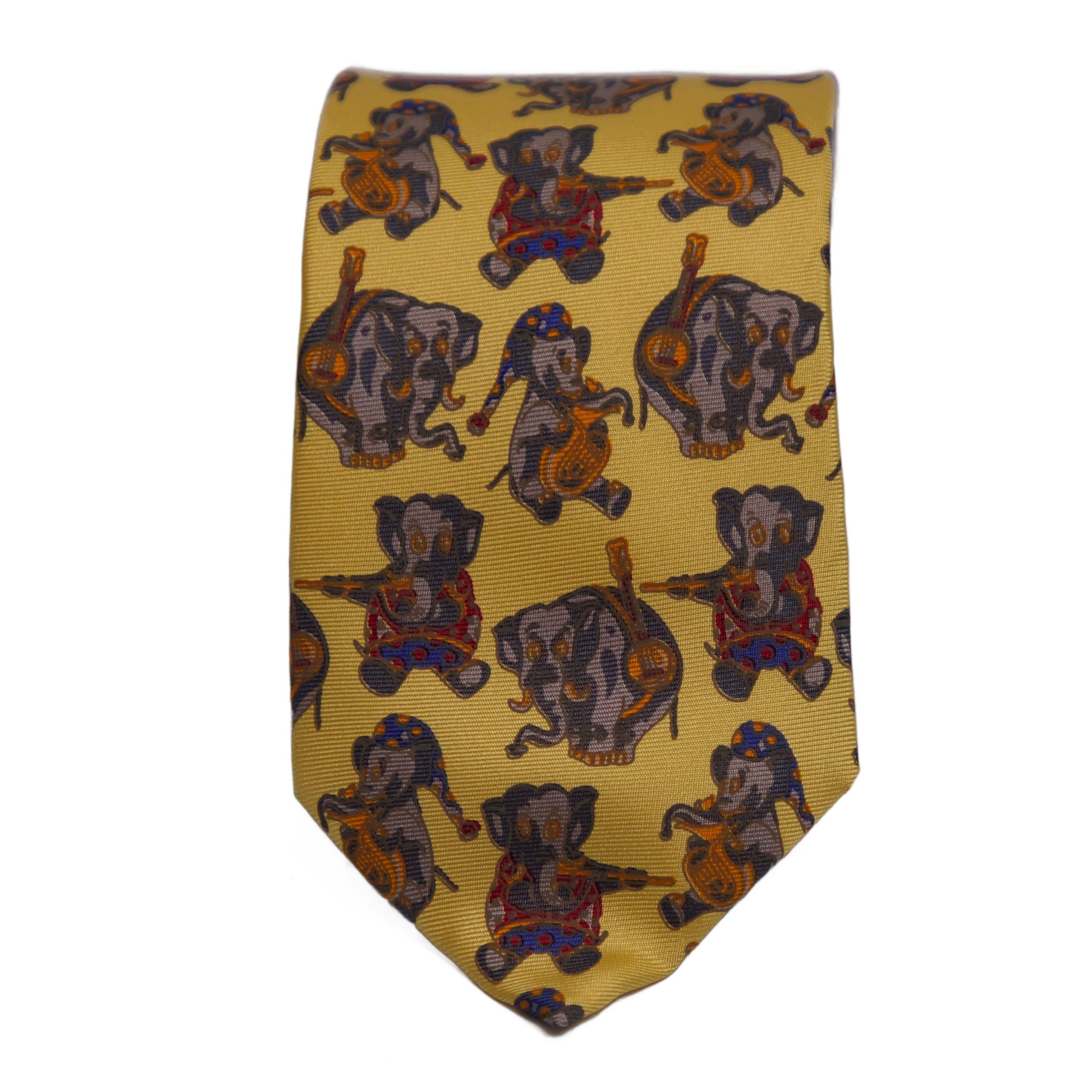 A yellow 100% silk tie with elephants playing instruments is a bright, playful, and eye-catching tie. This smooth, vibrant yellow tie with a pattern of musical instruments such as saxophones, guitars.